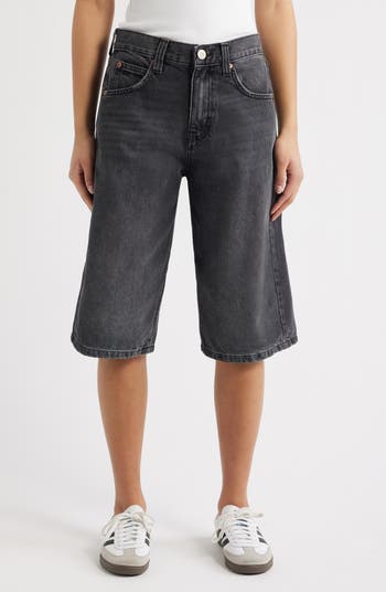 A wide-leg silhouette adds dramatic impact to longline Bermuda shorts made from faded black-wash nonstretch denim.