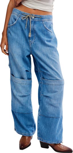 A cool and customizable fit, these bold cargo jeans made from nonstretch denim feature drawcord hems, a slouchy and relaxed fit and a laid-back drawstring waist.