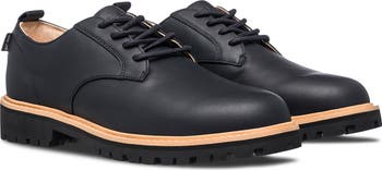 A well-lugged rubber sole grounds the hardworking comfort of a derby styled with minimal detailing for maximum versatility across your wardrobe. The plain toe and tonal laces enhance the sleek, simple styling that kicks up any casual look and relaxes a semiformal one.