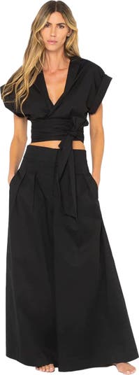 A must-have wide-leg pleated trouser with a wide waistband featuring functional pockets and clasp closure.