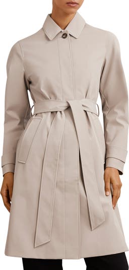 - Coat has hidden-button placket; spread collar; belted cuffs; front welt pockets; removable sash