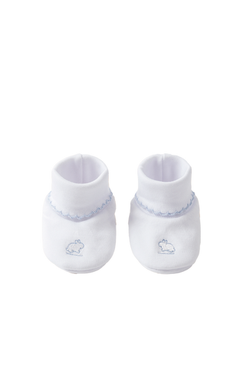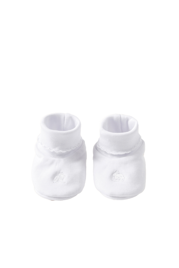 Our logo booties are crafted from 100% pima cotton, ensuring a soft and cozy feel. They come in an elegant all-white design with embroidered thread details that make them stand out. Additionally, they are available with accents in pink, blue, or white, making them easy to pair with various outfits. Keep your baby stylish and warm with these versatile booties!