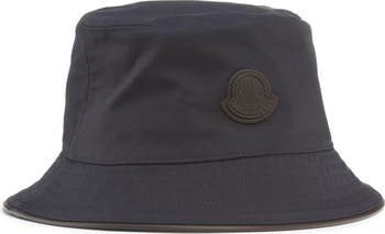A layered leather patch features the French label's classic cockerel logo on a sleek bucket hat trimmed with a contrast brim.