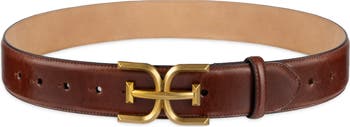 Define your silhouette with this slim leather belt featuring a signature double-E logo buckle in brushed goldtone plate.
