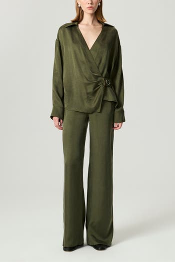 Elevate your wardrobe with this effortlessly chic satin blouse, designed in a relaxed fit with a sophisticated draped wrap front. Featuring a collared neckline, long sleeves with buttoned cuffs, and a sculptural buckle detail at the waist, it’s finished with a self-tie back belt for a tailored silhouette. The soft satin fabric adds subtle sheen, making it perfect for both daytime polish and evening elegance.