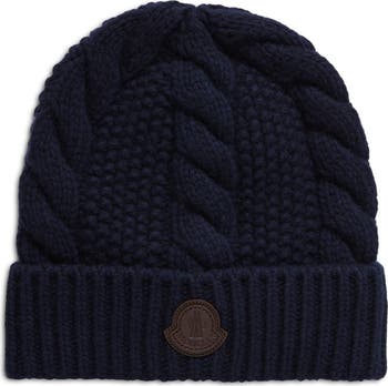 A leather logo patch brands this casually cuffed beanie knit from virgin wool and cashmere with chunky cables.