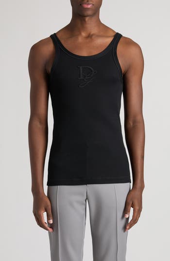 The label's new monogram logo at the chest subtly brands a ribbed tank top fashioned from airy Italian cotton.