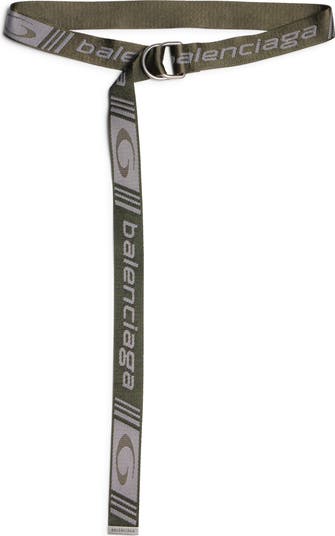 Jacquard logo details span the length of a belt made of sturdy webbing and cinched with D-ring hardware for a casual, industrial vibe.
