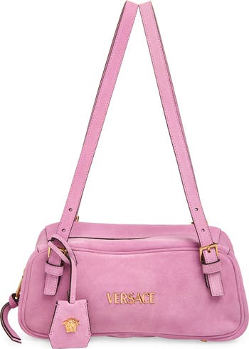 A signature Medusa head and glinting logo lettering brand an elongated shoulder bag made from calfskin suede in a pretty pink hue.