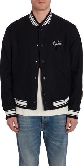 Golden Goose puts their signature stamp on old-school style with this wool varsity jacket detailed with logo embroidery and framed with striped ribbed trim.