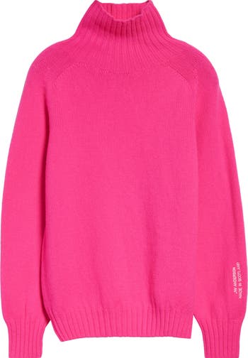 High-contrast embroidery pops at the one sleeve of this cozy turtleneck sweater knit from warm wool yarn and bordered by chunky ribbed trim and roomy raglan sleeves.