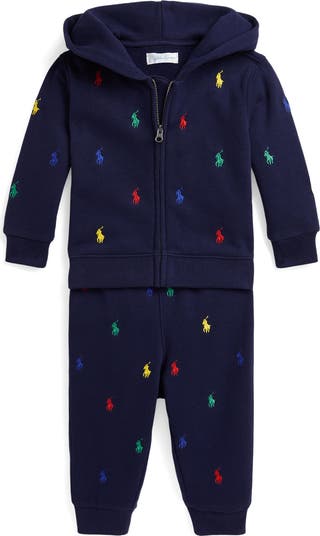 Colorful logos are embroidered all over a two-piece set featuring a full-zip hoodie paired with comfy elastic-waist sweatpants.
