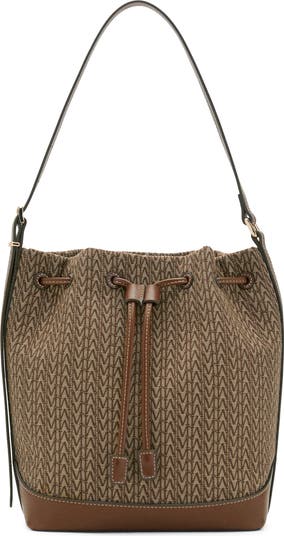 A logo-jacquard exterior and contrasting trims provide textural interplay on this spacious bucket bag secured with a drawstring closure and and suspended from an adjustable shoulder strap.