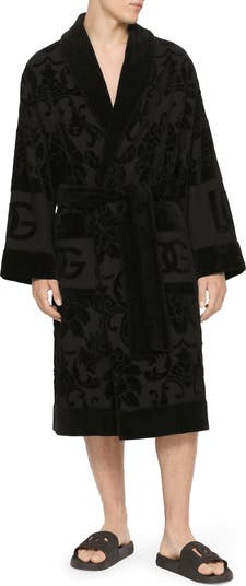 This elegant cotton terry bath robe boasts a damask jacquard pattern as well as bold logo monograms at the pockets, sleeves and back.