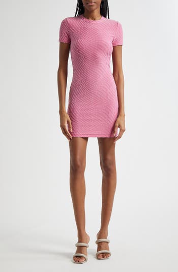 Raised terry logos run on repeat in an undulate pattern on this stretch-kissed minidress made for the full-grown, bold individual.