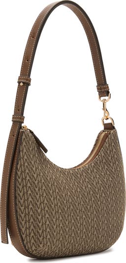 A logo-jacquard exterior and contrasting trims provide textural interplay on this structured shoulder bag featuring a half-moon profile and suspended from a convertible strap.