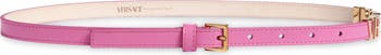 Golden logo lettering stands out against the dragonfruit-inspired hue of a slender belt crafted from supple Italian leather.