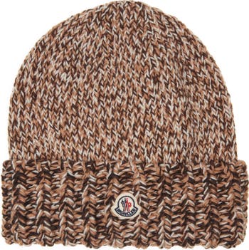 Stay warm on snowy slopes or city streets in this ribbed wool beanie with a wide cuff sporting Moncler's instantly recognizable cockerel logo patch.
