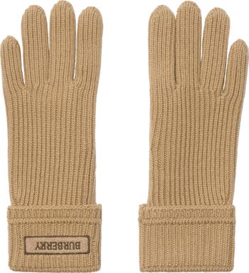 A pair of wool blend gloves, made at a 200-year-old mill in Scotland. The rib-knit style features an appliquéd patch embroidered with our logo.||Embroidered Burberry lettering at cuffs