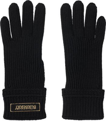 A pair of wool blend gloves, made at a 200-year-old mill in Scotland. The rib-knit style features an appliquéd patch embroidered with our logo.||Embroidered Burberry lettering at cuffs