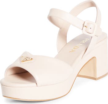 Prada's iconic triangular logo shines atop this lambskin-leather sandal elevated on a wrapped block heel and platform.
