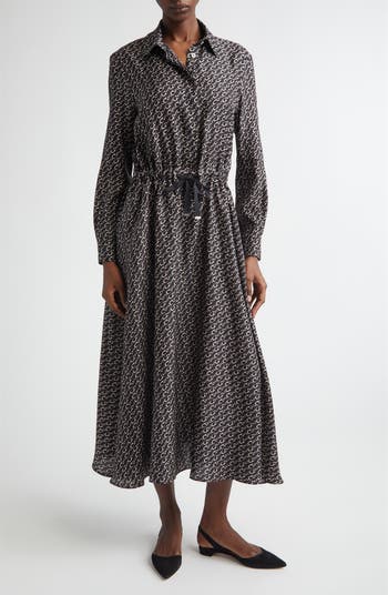 Covered in a diagonally oriented logo print, this relaxed-fit silk shirtdress is cinched at the waist with a metal-tipped grosgrain drawstring before flaring into a swishy skirt.