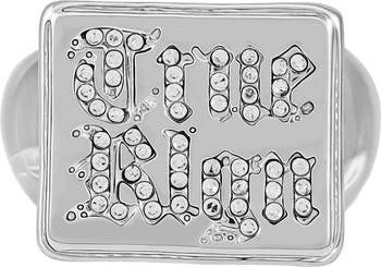 Make a bold statement with this True Religion square ring, featuring gothic-inspired crystal script that shines with attitude. Sleek, edgy, and unmistakably iconic—this piece delivers standout style with every gesture.