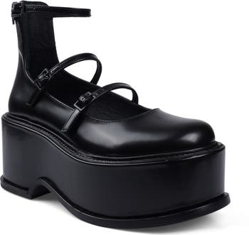 Make a bold entrance in this chunky platform mary jane showcasing slender buckle straps and a back zipper for easy entry.