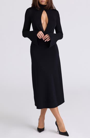 This soft, silky sweater-knit bodysuit brings dramatic flair with a plunging peekaboo cutout and long sleeves flared with bell cuffs.