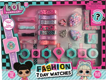 LOL SURPRISE: 7 DAY FASHION WATCHES - Fun and interactive accessory that combines practical timekeeping with creative play, appealing directly to children who enjoy both fashion and imaginative play with LOL. MIX & MATCH STYLES: With all the tools necessary to personalize your watch, discover the ultimate in customizable fun with Mix & Match Styles watches! These innovative timepieces let kids express their unique style every day with interchangeable bands and faces. Whether they're feeling colorful and playful or sleek and sophisticated, there's a combination to match every mood and outfit. Encouraging creativity and personal expression, these watches are more than just timekeepers—they're a canvas for imagination. Each set includes a surprise toy, adding an extra element of excitement to every unboxing experience. It's not just a watch it's a daily surprise waiting to be discovered! WITH A WATCH FOR EACH DAY OF THE WEEK, the Seven Day Set ensures that kids always have a fresh accessory to complement their look. And with the included customization kit featuring colorful bands and playful watch faces, the possibilities for personalizing their watch are endless. They seamlessly blend practical timekeeping with creative play, making them a captivating accessory for young fashionistas and adventurers alike. Officially licensed by LOL Surprise, these watches are the perfect gift for fans of the beloved toy brand. Whether they're obsessed with LOL dolls or simply love fashion and fun, these watches promise hours of entertainment and endless style possibilities. Treat the young trendsetter in your life to a watch that's as unique and playful as they are!