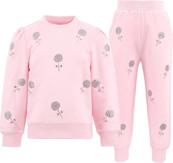 Adorable pink sweatshirt and jogger set featuring shimmering crystal lollipop embellishments. Puff shoulder detail and ribbed cuffs add a stylish and playful touch. Comfortable and stylish for everyday wear, playdates, or special outings.