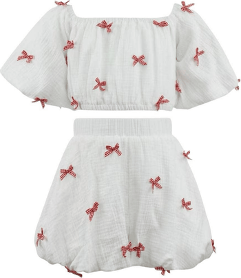 Charming two-piece set with puff sleeves and playful red gingham bow details throughout Features a smocked neckline and waistband for a comfortable yet stylish fit Bubble-style silhouette adds volume and flair, perfect for special outings or sunny days