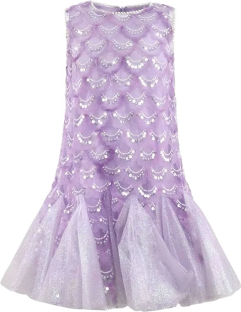 Dive into enchantment with this stunning mermaid-inspired tutu dress, featuring shimmering scale-like sequins that catch the light beautifully. Designed with a layered, flared tulle skirt that adds volume and elegance, perfect for twirling. The soft lavender & hue and intricate details make this dress ideal for special occasions and magical playtime.