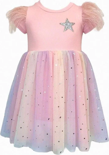 Adorable party dress featuring a shimmering star embellishment on the bodice and a colorful tulle skirt, perfect for making a statement. Designed with soft feathered sleeves for an extra touch of elegance and whimsy, ideal for special occasions and celebrations. Comfortable and stretchy bodice paired with a full, multi-layered tutu skirt for twirling and dancing at any festive gathering. High-quality materials ensure durability and style, making it a must-have addition to any girl's wardrobe.