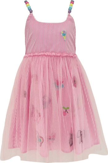 Adorable pink dress with striped bodice, colorful beaded straps, and a playful tulle overlay. Features fun candy-themed patches and whimsical designs for a sweet, standout look. Perfect for birthdays, parties, or adding a touch of magic to any occasion.