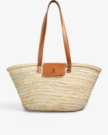 Raffia handbag designed with a sturdy leather handle and secure clip closure, ideal for chic everyday use.