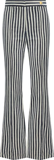 The Lola is a high rise pant with a flat waistband fitting at the natural waist. The slim fitting silhouette is flared from the knee to the ankle cropped hem. The Lola also features a stitched front crease to further elongate the flattering shape. Made from organic Italian denim with authentic indigo dyed yarns and alternating Natural color stripes.