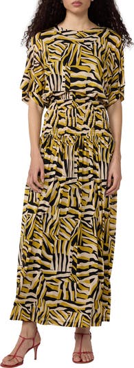A bold geometric pattern takes center stage on this short-sleeve maxi dress fashioned with a smocked waist for added structure.