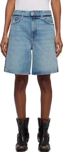 Designed to hit just above the knees, these nonstretch-denim shorts are ripped and repaired at the waist and sides to create a cool DIY look.