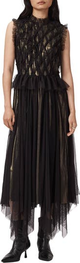 Party season is made for thrills and frills so make the rounds in this dark-romance stunner: the sheer mesh overlay of the dress gives a peek of the metallic fabric beneath for golden glam. The diamond-lattice bodice, traced with ruffles, gives way to a gathered skirt with an asymmetric hem for an element of edge.