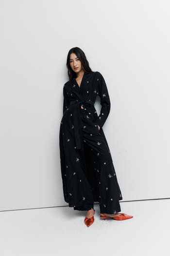 A lightweight shirtdress with a button-through front, pleated waist detailing, and a removable belt for versatile styling. Finished with delicate floral embroidery for a subtle romantic touch.