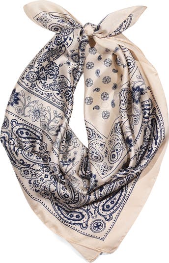 Intricate paisley scrolls bring rich detail to this satin square scarf designed for versatile styling at the neck, in the hair or tied to your favorite bag.