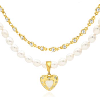 Create a layered look that instantly elevates your look with this multistrand necklace set with a sparkling heart pendant and luminous freshwater pearls.