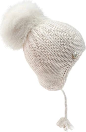 - This aviator-style pom hat for kids features faux fur pom and is 100% cashmere for a luxurious feel. Crafted in classic beige and baby blue colors, this hat is perfect for keeping children warm and stylish. With a timeless style, this hat can be enjoyed year after year. 100% Mink Cashmere Detachable faux fur pom Unlined, medium weight Unisex Provides excellent ear coverage Tassels are decorative Imported Available in 2 sizes: Small (Newborn to 12M) and Medium (12M -5 Years) Care Instructions: For washing, remove pom. Hand wash in cold water, mild detergent. Hang to dry.