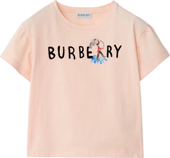 A crew-neck T-shirt in cotton jersey with gathered cap sleeves. The style is printed with our logo and a hand-painted London guard, holding a check umbrella and marching through a puddle. ||Rib-knit neckline|Printed Burberry lettering