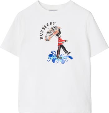 A crew-neck T-shirt in cotton jersey. The style is printed with a hand-painted London guard holding a check umbrella and marching through a puddle. ||Rib-knit neckline|Printed Burberry lettering at front