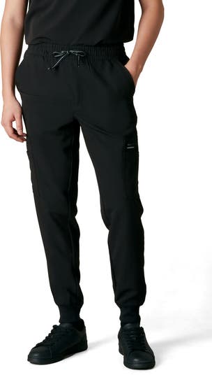 Men's scrub jogger cargo pant features: premium 4 way stretch fabric with anti-microbial, moisture wicking, anti-wrinkle properties for superior comfort. Utilitarian design with modern fit, Sporty / comfortable ribbed ankle cuffs. Total 11 pockets. Elasticated waistband with drawcord. Elastic loop at waist for id card. Double stitch seams for better strength. Inside overlock stitch for stronger seam. Fabric composition: 0.72 polyester 0.21 rayon 0.07 spandex total 11 pockets (2 trouser pockets, 2 back welt pockets, 1 tech pocket.