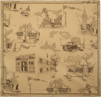 A scarf made in Italy from silk twill. The design is printed with hand-drawn artwork depicting iconic London landmarks including the Houses of Parliament, Tower Bridge, Trafalgar Square and our Horseferry House headquarters. ||Square|Hand-rolled edges|Printed Burberry lettering at border