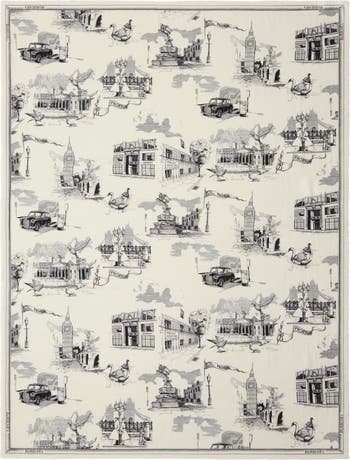 A lightweight scarf made in Italy from wool silk. The design is printed with hand-drawn artwork depicting iconic London landmarks including the Houses of Parliament, Tower Bridge, Trafalgar Square and our Horseferry House headquarters.||Rectangular|Eyelash fringing at edges|Printed Burberry lettering at border