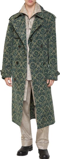 Debuted on the Burberry Winter 2025 runway, a trench coat tailored from a lightweight viscose blend and printed with a Baroque-style pattern inspired by the exquisite, faded interiors of British stately homes. A relaxed fit and raglan construction give a softer line at the shoulders, while an archival trench inspires the curlicue shape of the pockets. Adjust the shape with the B buckle belt.||Double-breasted button closure|Hook-and-eye collar closure|Throat latch|Epaulettes|B buckle belt|Side button welt pockets|Belted cuffs|Back button vent|Unlined|Comes with a garment bag